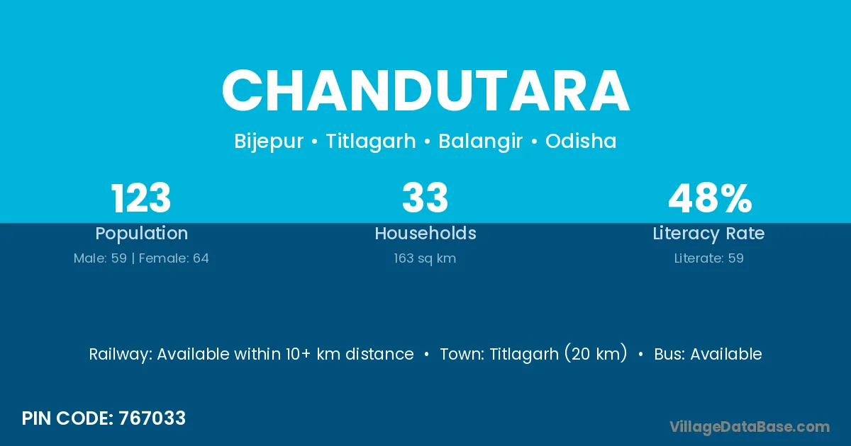 Titlagarh (20 km) is the nearest town to Chandutara village for major economic activities and is located approximately 20 km away.