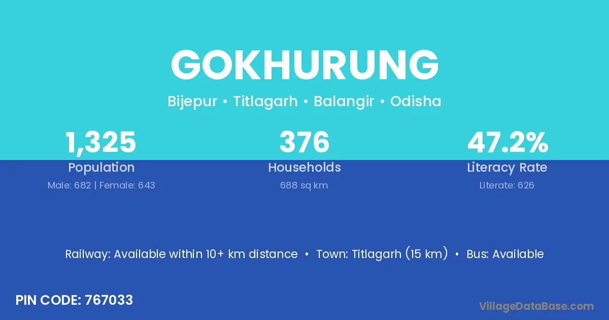 Titlagarh (15 km) is the nearest town to Gokhurung village for major economic activities and is located approximately 15 km away.