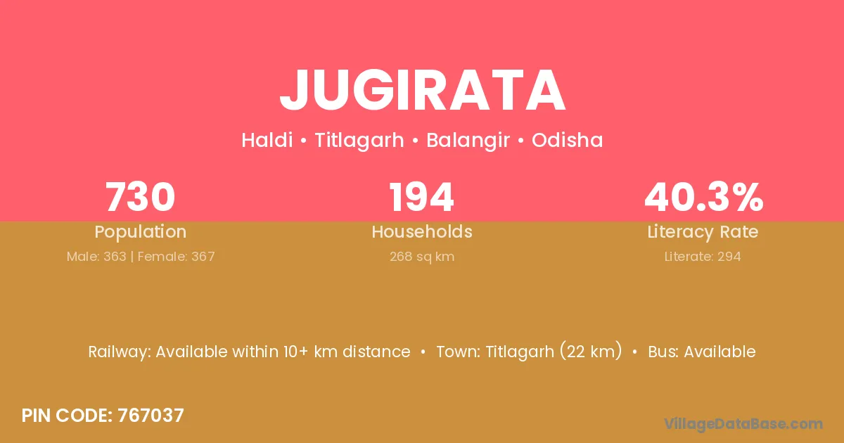 Titlagarh (22 km) is the nearest town to Jugirata village for major economic activities and is located approximately 22 km away.