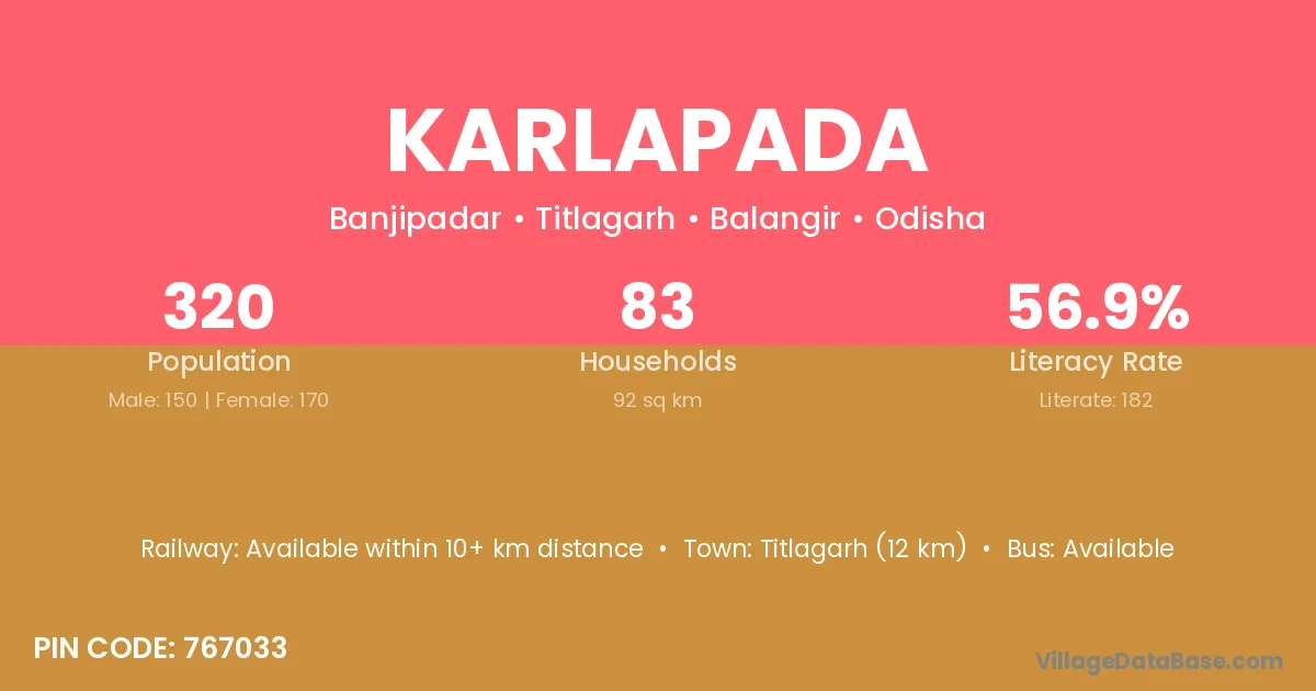 Titlagarh (12 km) is the nearest town to Karlapada village for major economic activities and is located approximately 12 km away.