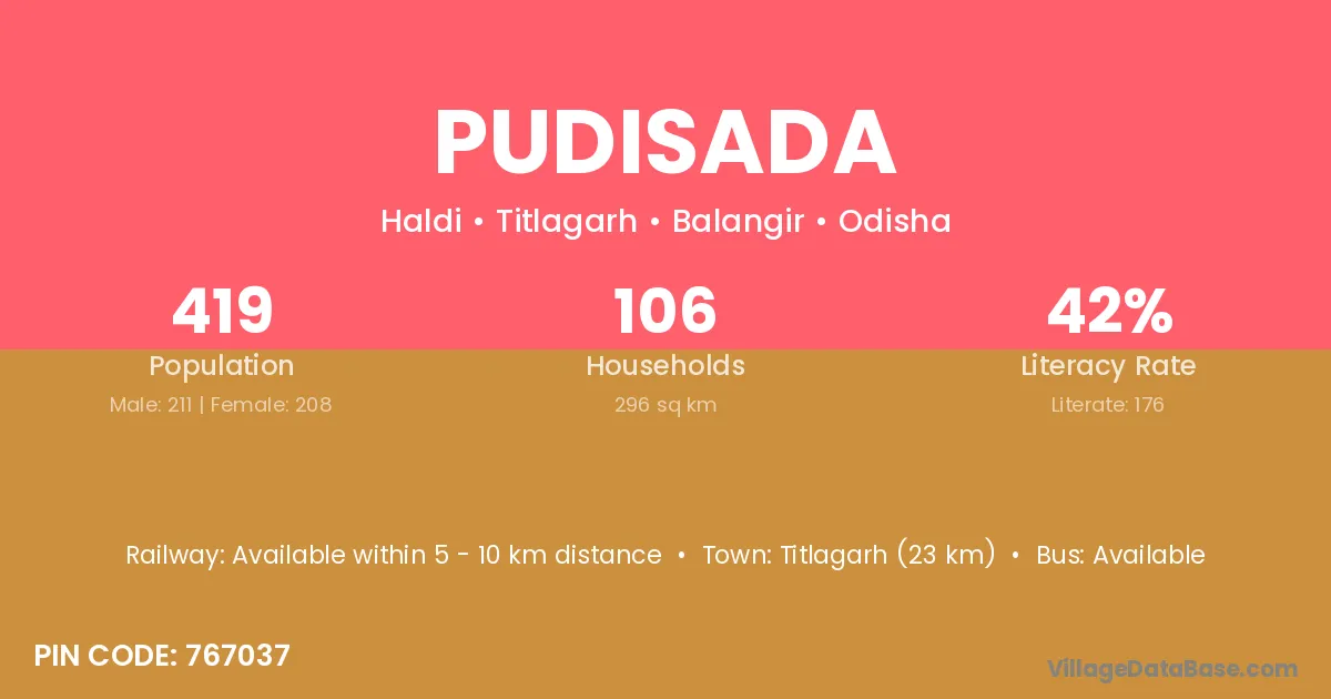 Titlagarh (23 km) is the nearest town to Pudisada village for major economic activities and is located approximately 23 km away.