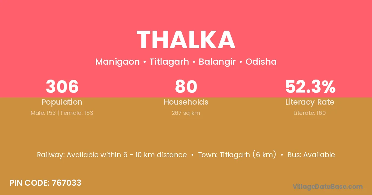 Titlagarh (6 km) is the nearest town to Thalka village for major economic activities and is located approximately 6 km away.