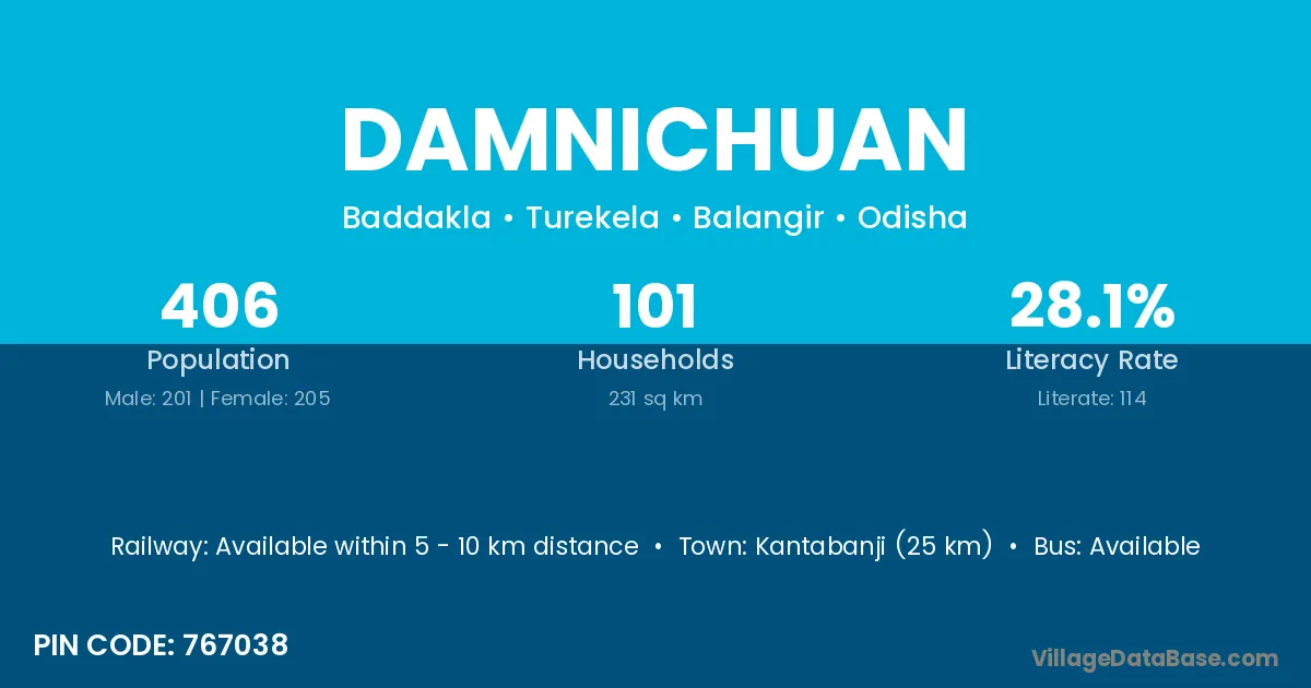 Kantabanji (25 km) is the nearest town to Damnichuan village for major economic activities and is located approximately 25 km away.