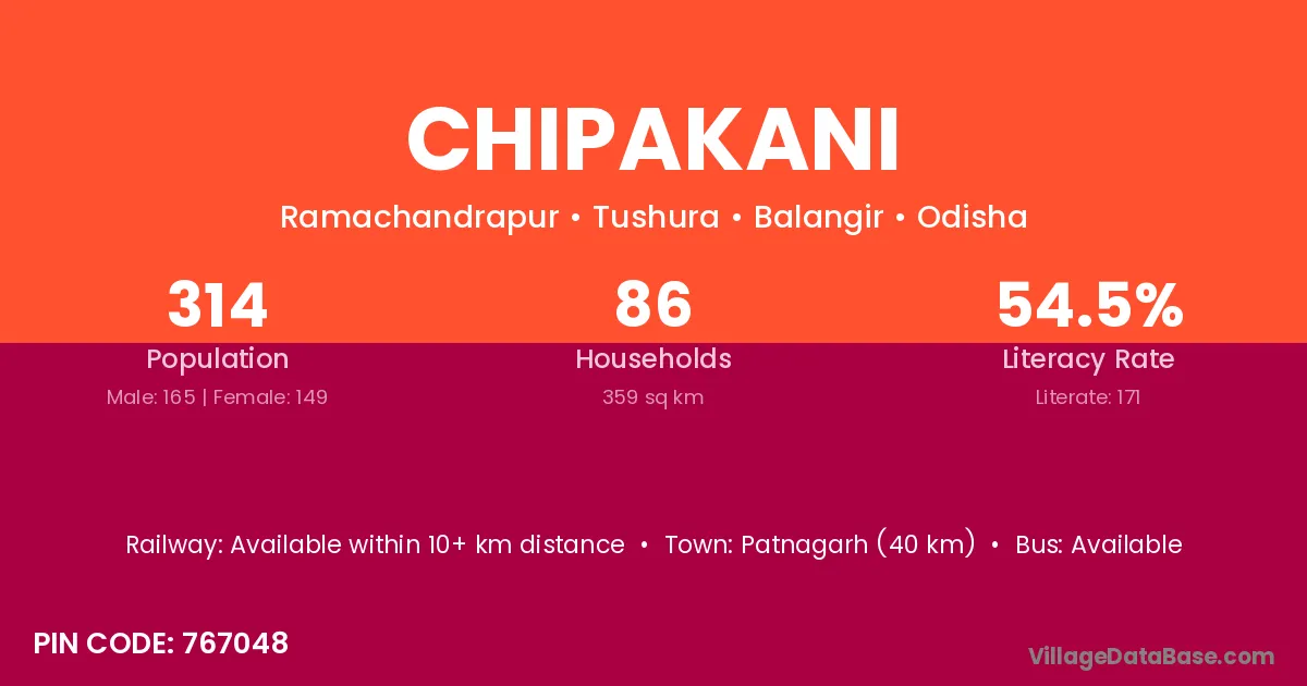 Patnagarh (40 km) is the nearest town to Chipakani village for major economic activities and is located approximately 40 km away.