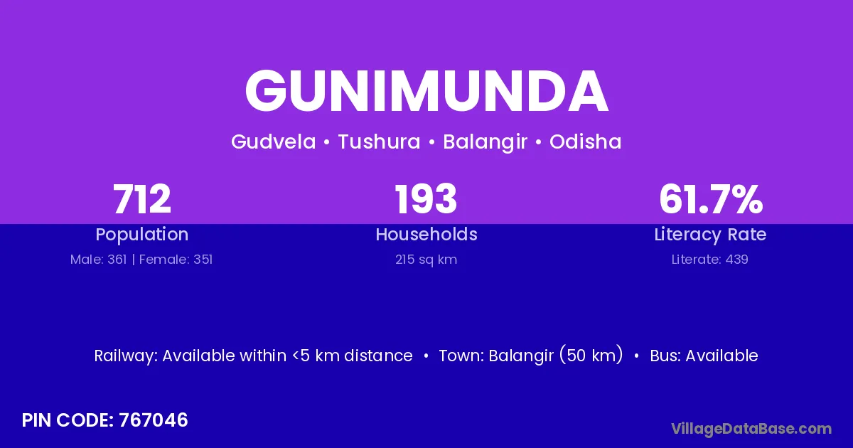 Balangir (50 km) is the nearest town to Gunimunda village for major economic activities and is located approximately 50 km away.