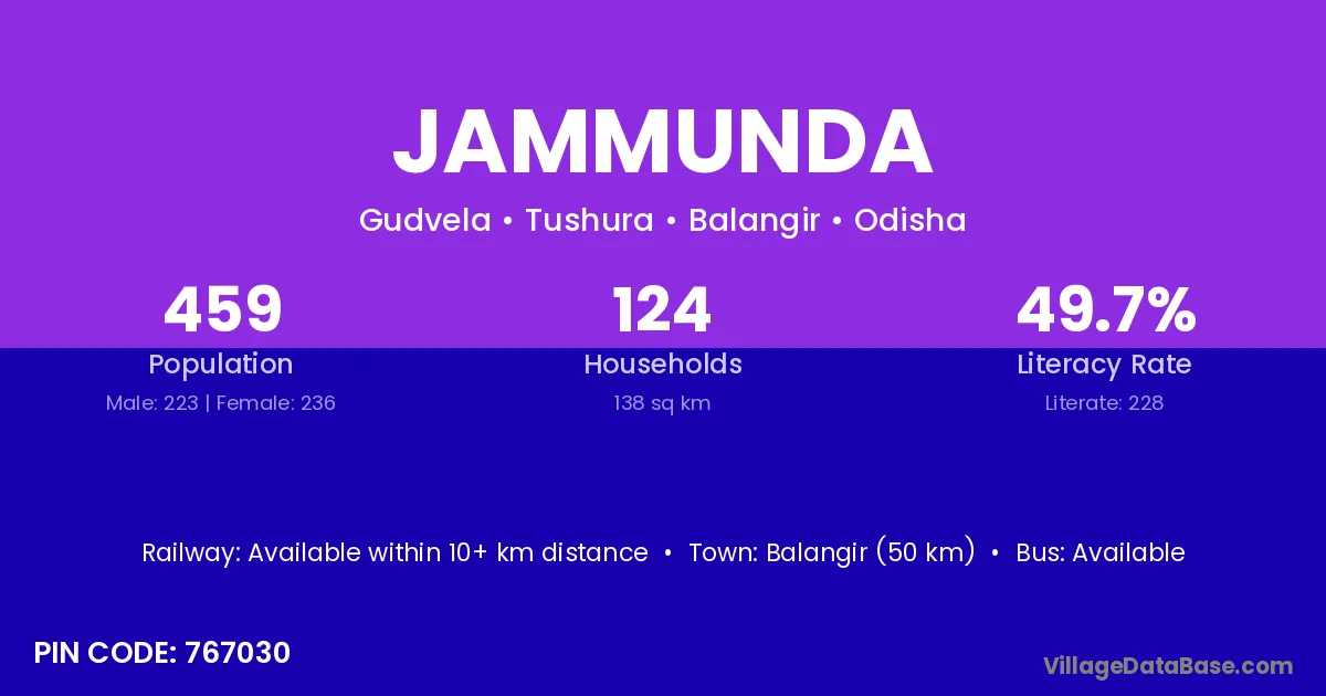 Jammunda village has a total population of 459 people, of which 223 are males and 236 are females.