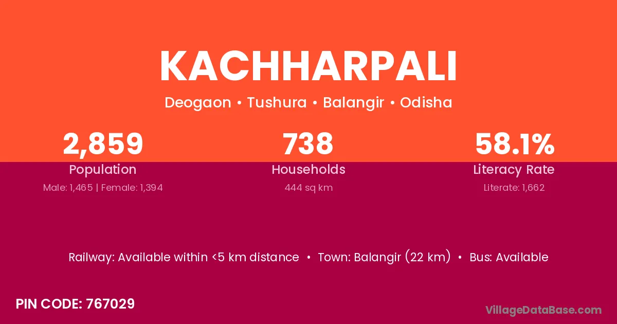 Kachharpali village has a total population of 2,859 people, of which 1,465 are males and 1,394 are females.