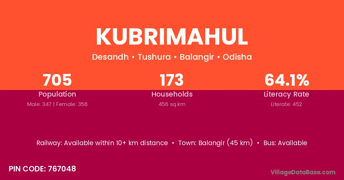 Balangir (45 km) is the nearest town to Kubrimahul village for major economic activities and is located approximately 45 km away.