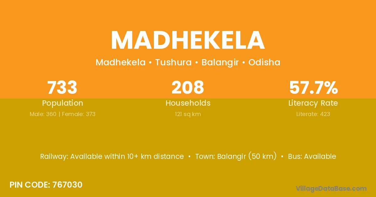 Balangir (50 km) is the nearest town to Madhekela village for major economic activities and is located approximately 50 km away.
