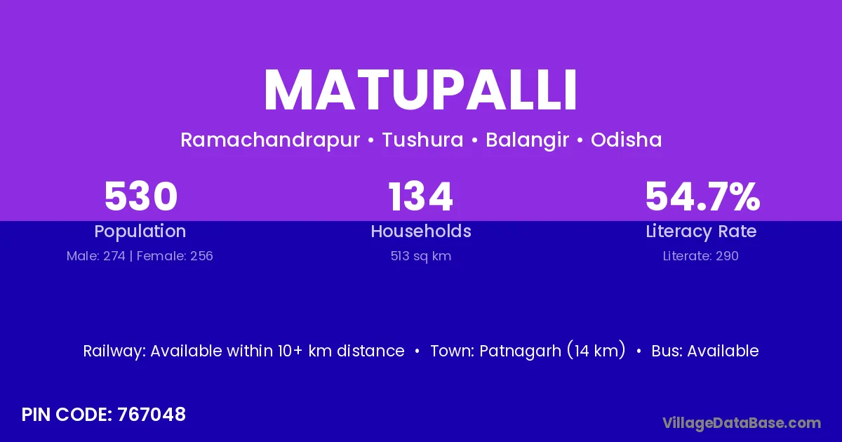 Matupalli village has a total population of 530 people, of which 274 are males and 256 are females.