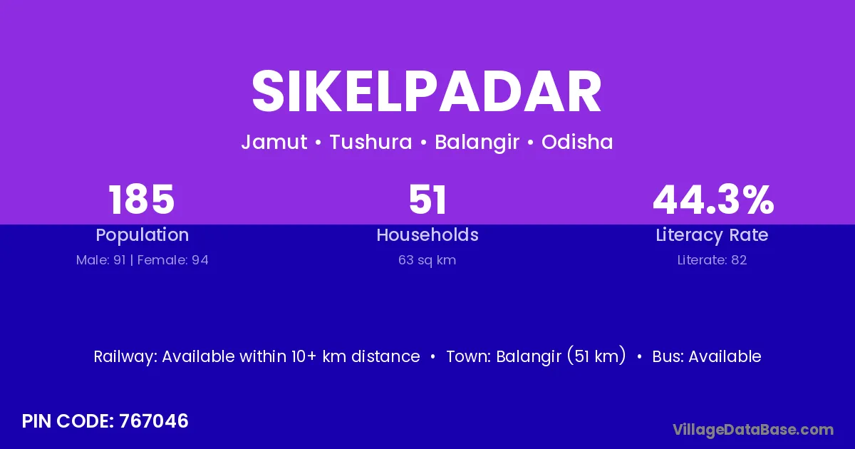 Balangir (51 km) is the nearest town to Sikelpadar village for major economic activities and is located approximately 51 km away.