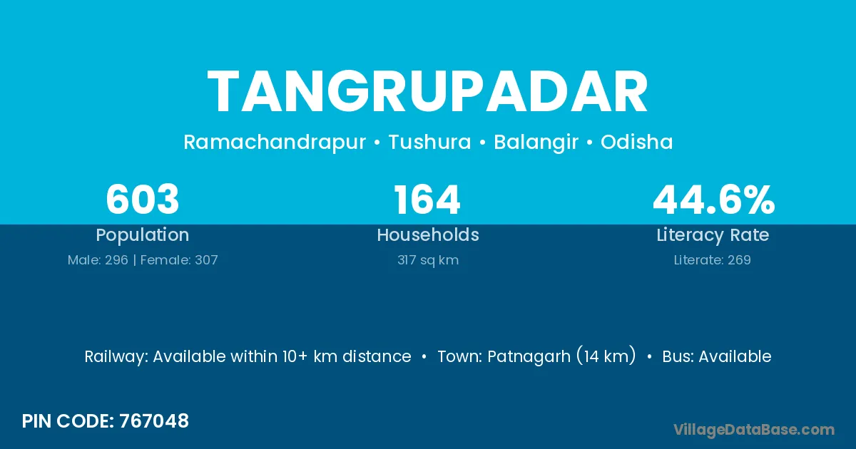 Tangrupadar village has a total population of 603 people, of which 296 are males and 307 are females.
