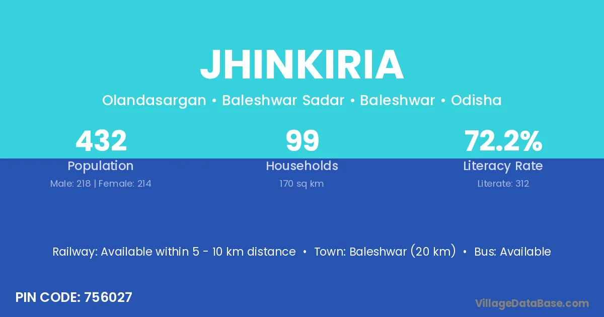 Jhinkiria village has a total population of 432 people, of which 218 are males and 214 are females.