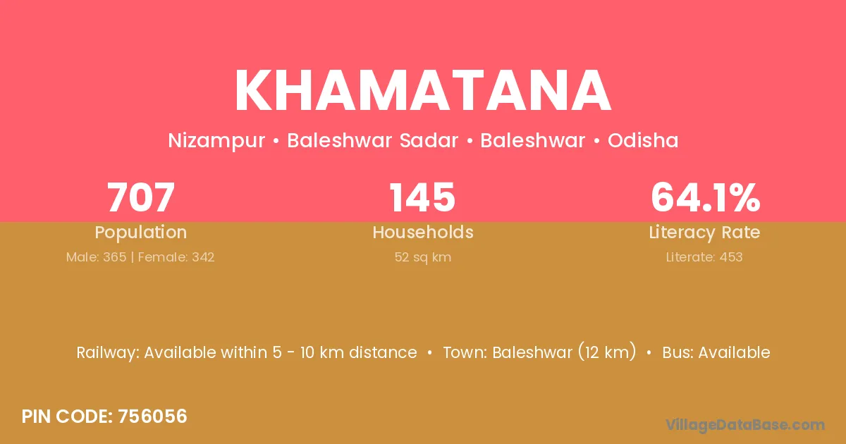 Baleshwar (12 km) is the nearest town to Khamatana village for major economic activities and is located approximately 12 km away.