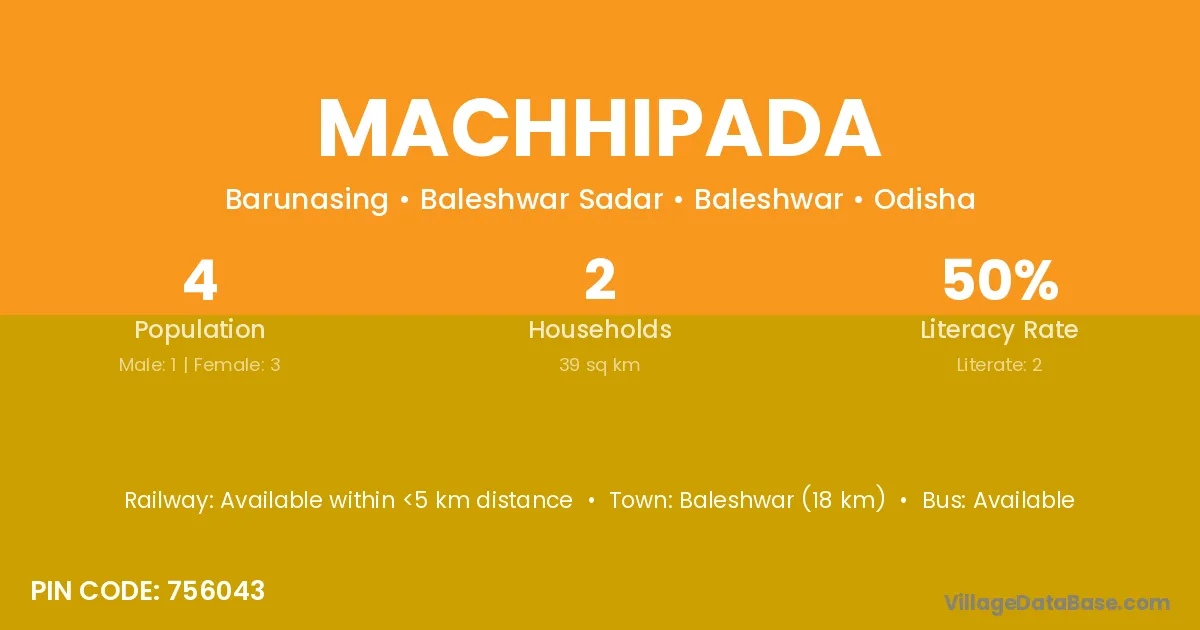 Baleshwar (18 km) is the nearest town to Machhipada village for major economic activities and is located approximately 18 km away.