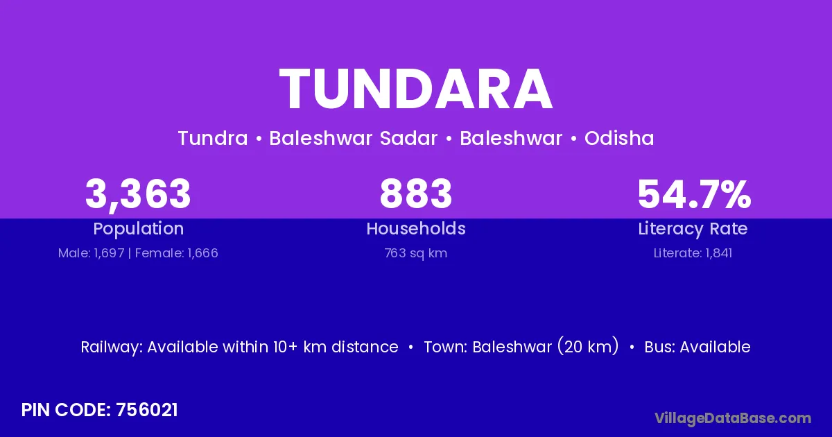 Baleshwar (20 km) is the nearest town to Tundara village for major economic activities and is located approximately 20 km away.