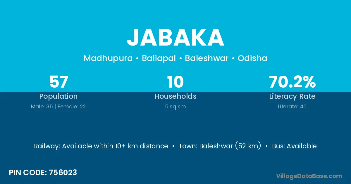Baleshwar (52 km) is the nearest town to Jabaka village for major economic activities and is located approximately 52 km away.