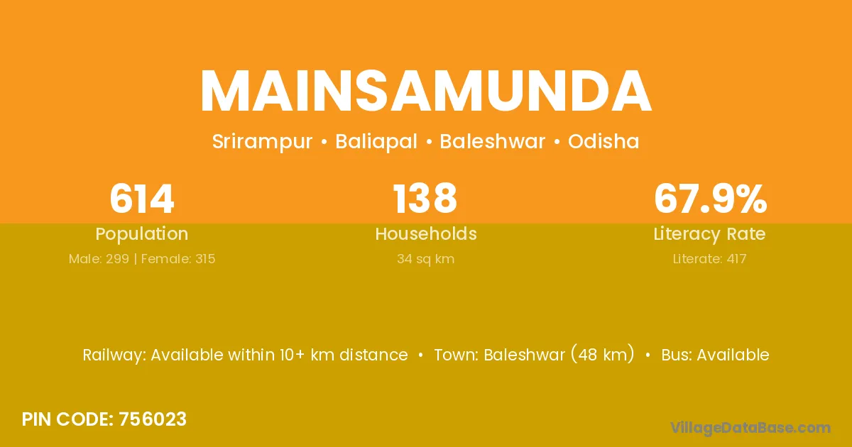 Baleshwar (48 km) is the nearest town to Mainsamunda village for major economic activities and is located approximately 48 km away.