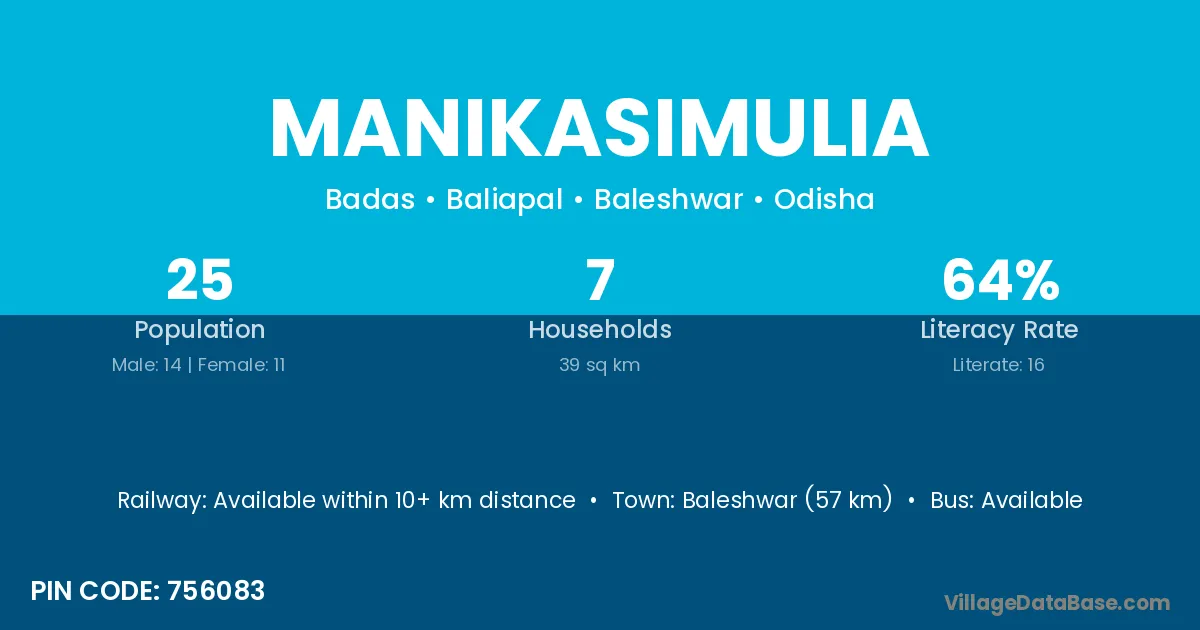 Baleshwar (57 km) is the nearest town to Manikasimulia village for major economic activities and is located approximately 57 km away.