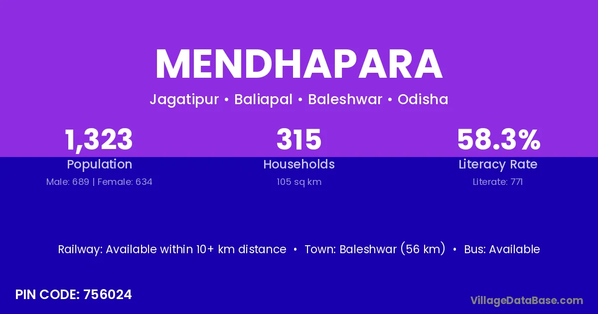 Baleshwar (56 km) is the nearest town to Mendhapara village for major economic activities and is located approximately 56 km away.