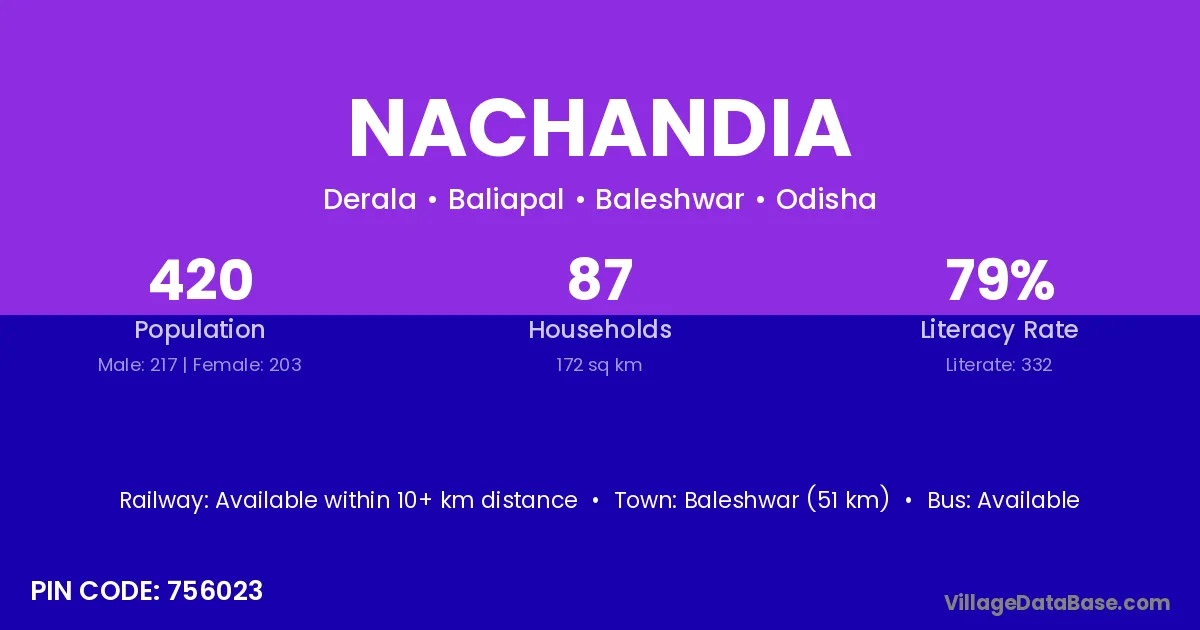 Baleshwar (51 km) is the nearest town to Nachandia village for major economic activities and is located approximately 51 km away.