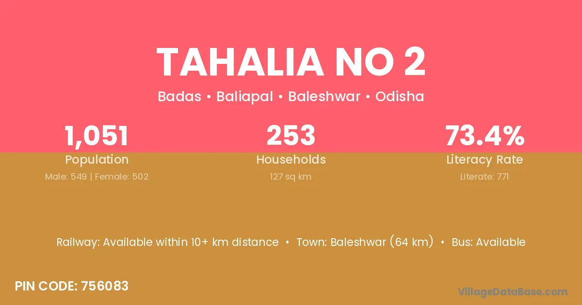 Baleshwar (64 km) is the nearest town to Tahalia No 2 village for major economic activities and is located approximately 64 km away.