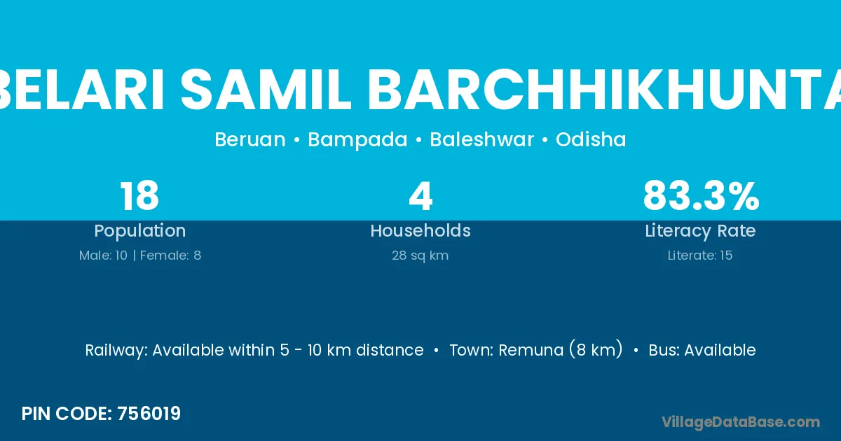 Remuna (8 km) is the nearest town to Belari Samil Barchhikhunta village for major economic activities and is located approximately 8 km away.