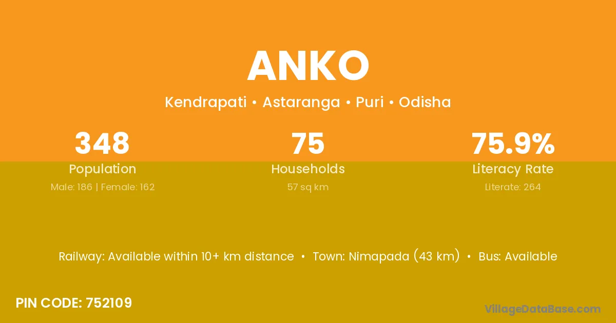 Baleshwar (20 km) is the nearest town to Anko village for major economic activities and is located approximately 20 km away.