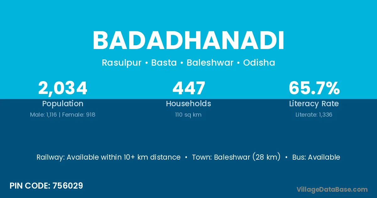 Baleshwar (28 km) is the nearest town to Badadhanadi village for major economic activities and is located approximately 28 km away.