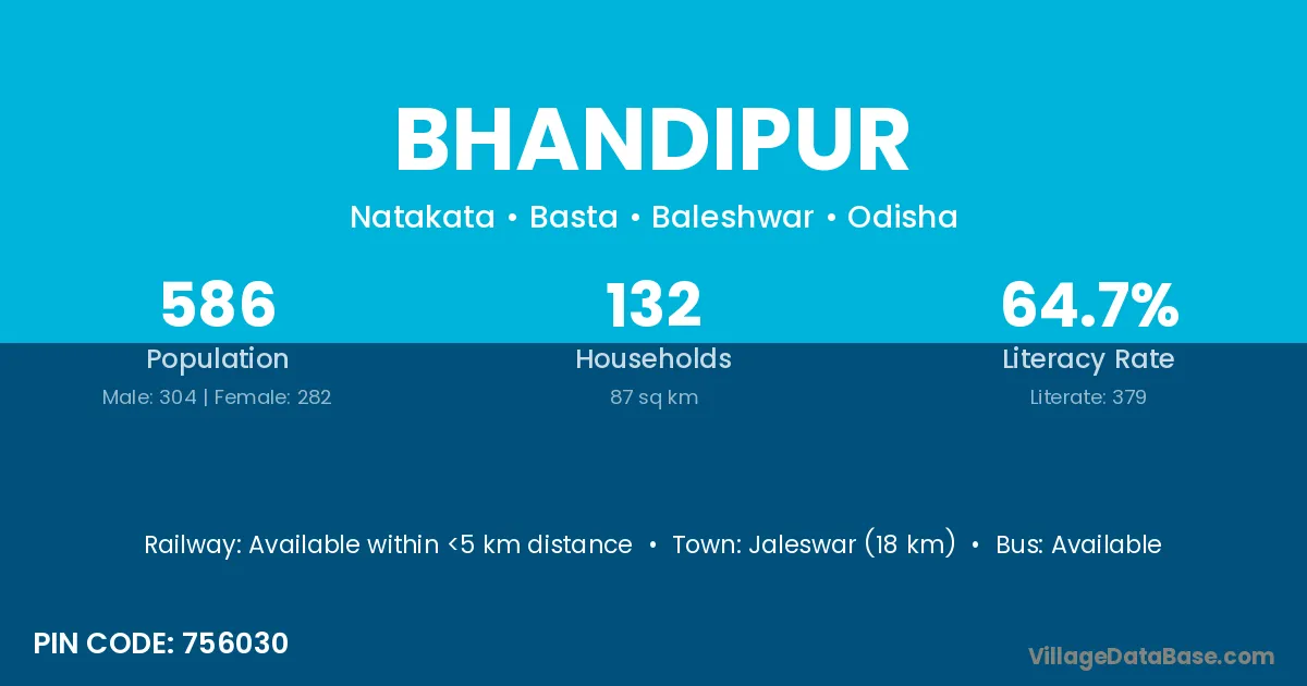 Jaleswar (18 km) is the nearest town to Bhandipur village for major economic activities and is located approximately 18 km away.