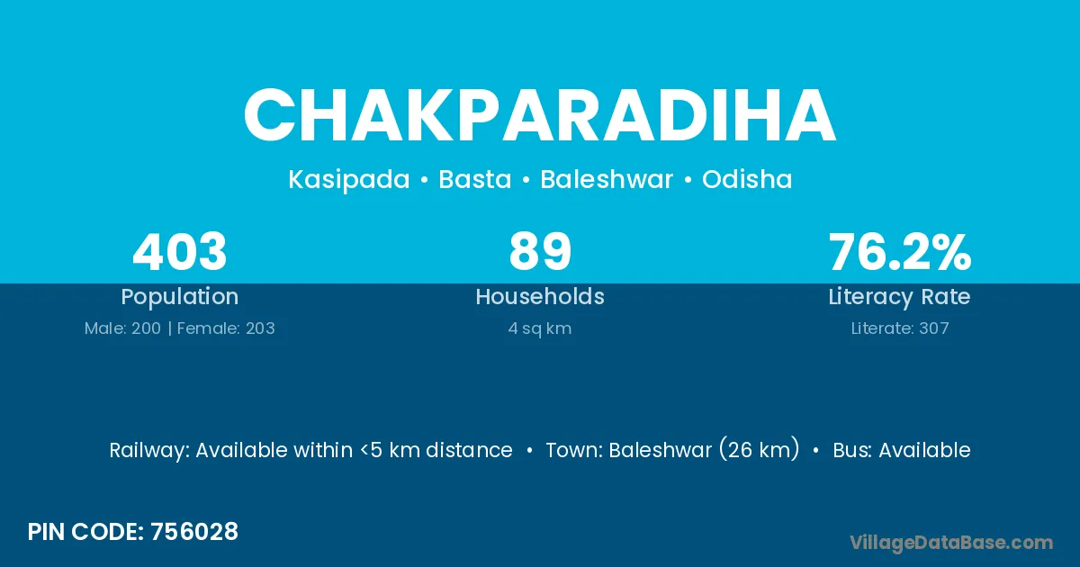 Baleshwar (26 km) is the nearest town to Chakparadiha village for major economic activities and is located approximately 26 km away.