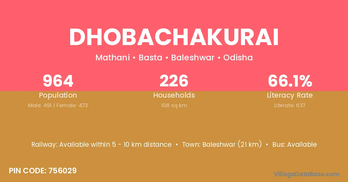 Baleshwar (21 km) is the nearest town to Dhobachakurai village for major economic activities and is located approximately 21 km away.