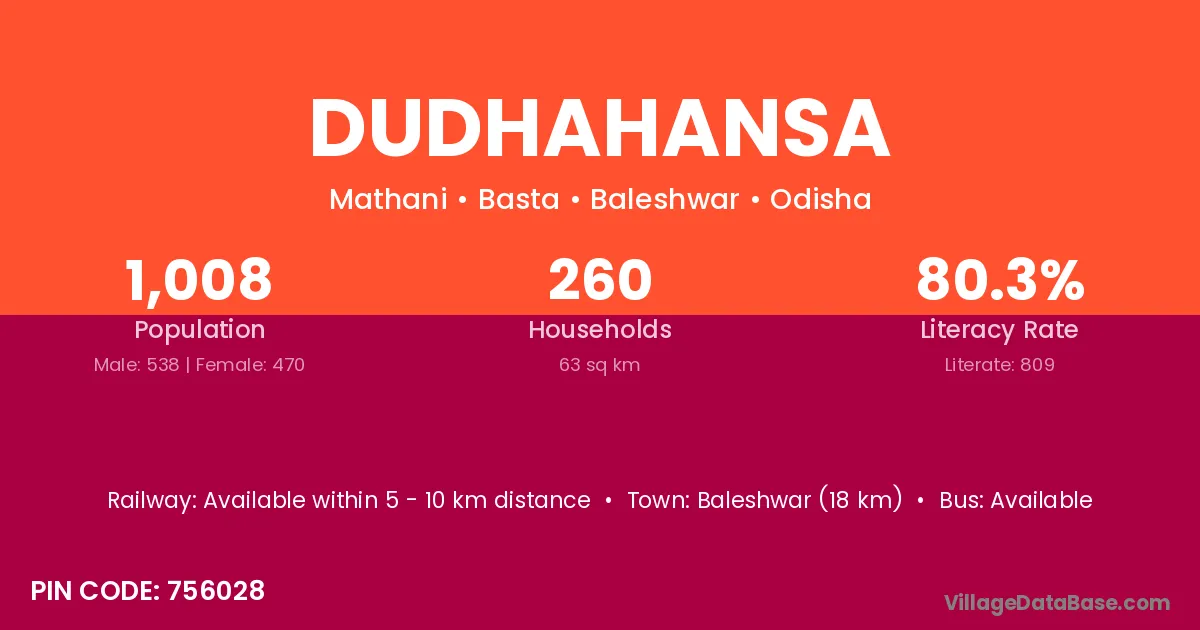 Baleshwar (18 km) is the nearest town to Dudhahansa village for major economic activities and is located approximately 18 km away.