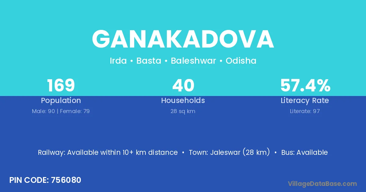 Jaleswar (28 km) is the nearest town to Ganakadova village for major economic activities and is located approximately 28 km away.