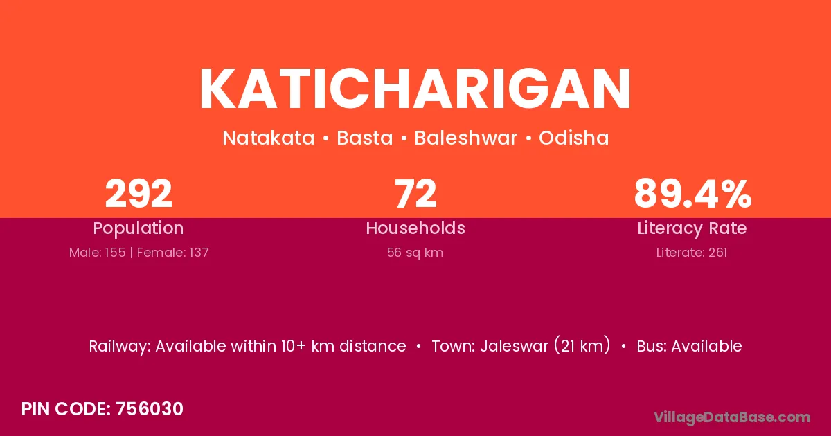 Jaleswar (21 km) is the nearest town to Katicharigan village for major economic activities and is located approximately 21 km away.