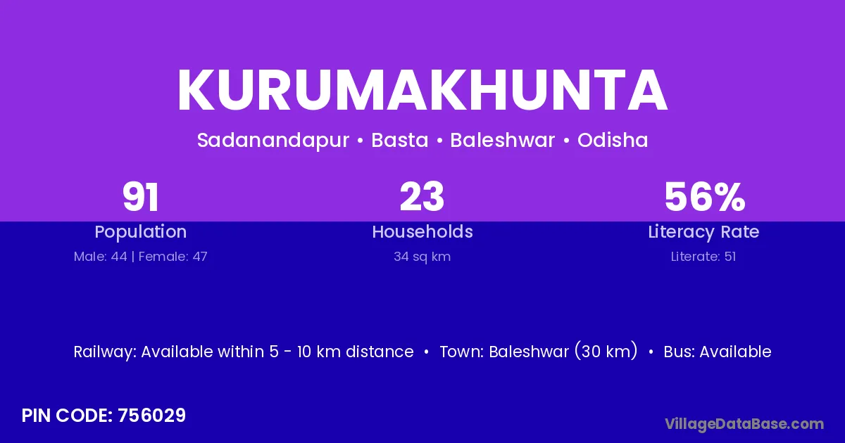 Baleshwar (30 km) is the nearest town to Kurumakhunta village for major economic activities and is located approximately 30 km away.
