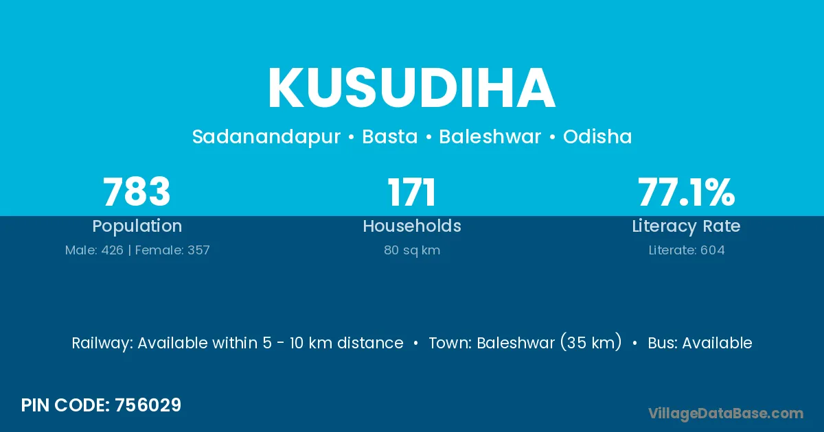 Baleshwar (35 km) is the nearest town to Kusudiha village for major economic activities and is located approximately 35 km away.