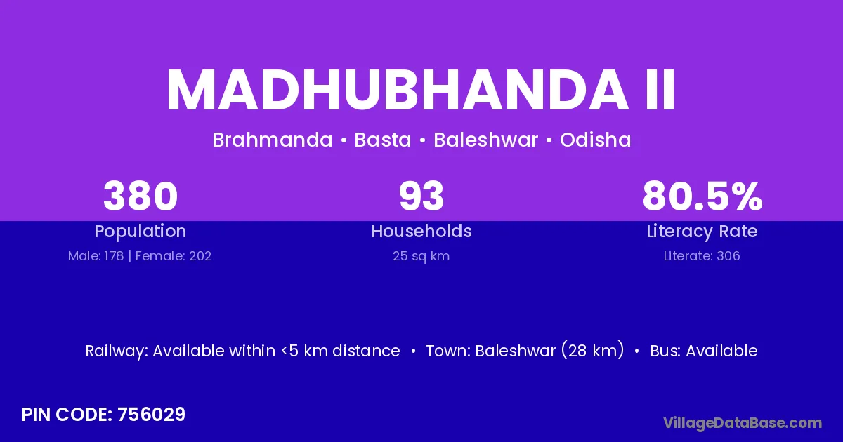 Madhubhanda Ii village has a total population of 380 people, of which 178 are males and 202 are females.