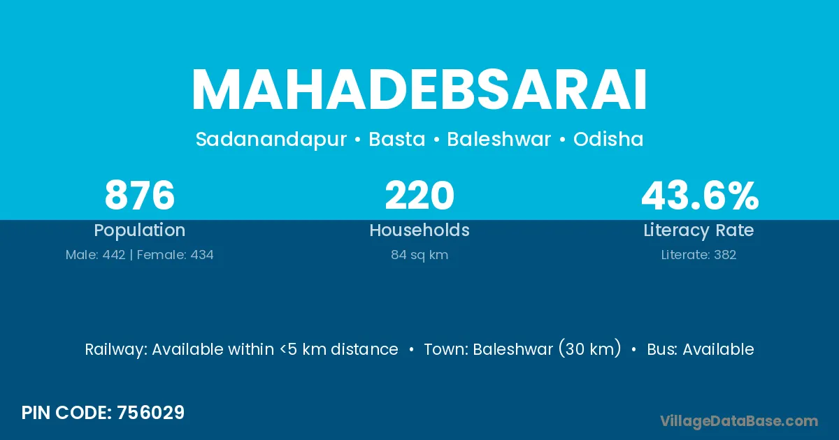 Baleshwar (30 km) is the nearest town to Mahadebsarai village for major economic activities and is located approximately 30 km away.