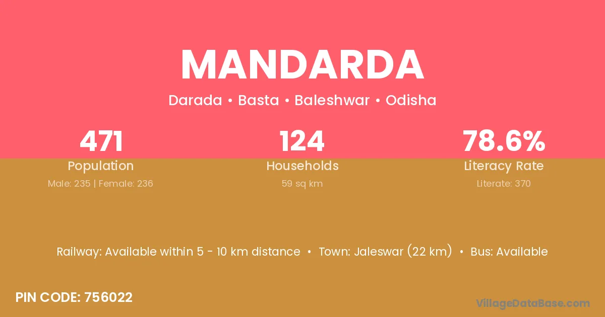 Jaleswar (22 km) is the nearest town to Mandarda village for major economic activities and is located approximately 22 km away.