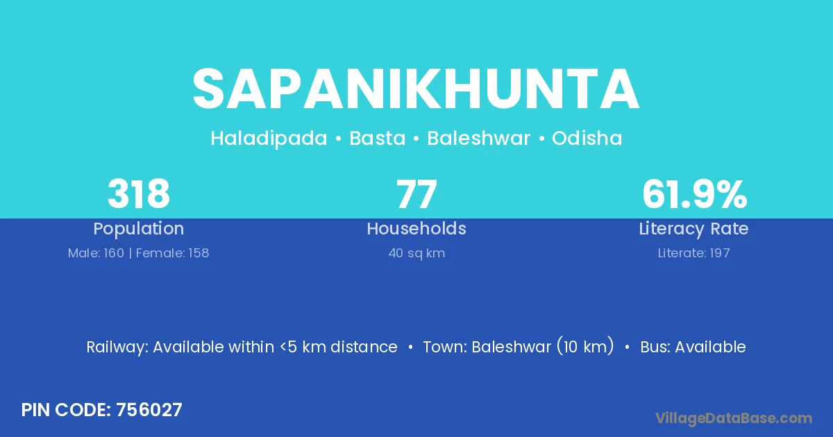 Baleshwar (10 km) is the nearest town to Sapanikhunta village for major economic activities and is located approximately 10 km away.