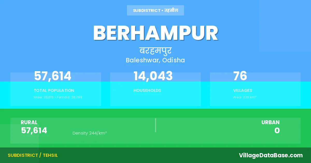 According to the 2011 census The total area of Berhampur Tehsil is 236 km², with a population of 57614 people. The population density is 244 inhabitants per square kilometre, and there are approximately 14043 houses in the sub district.