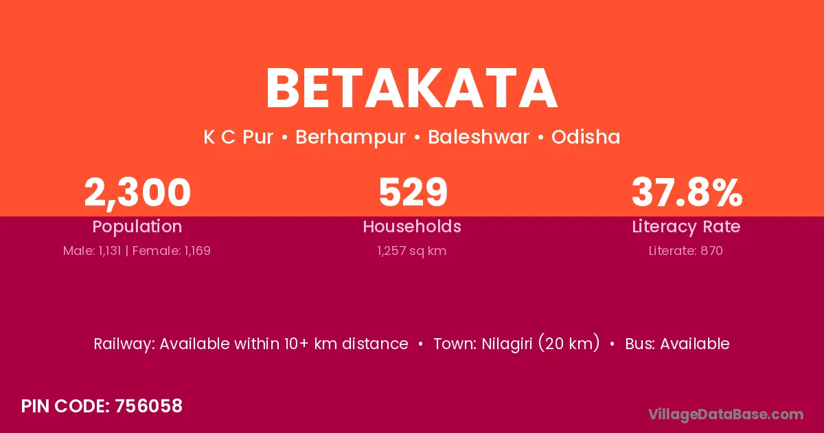 Nilagiri (20 km) is the nearest town to Betakata village for major economic activities and is located approximately 20 km away.