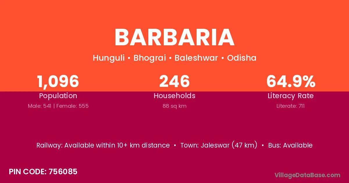Jaleswar (47 km) is the nearest town to Barbaria village for major economic activities and is located approximately 47 km away.