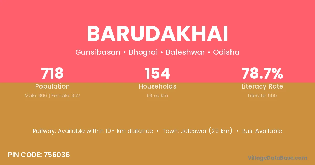 Jaleswar (29 km) is the nearest town to Barudakhai village for major economic activities and is located approximately 29 km away.