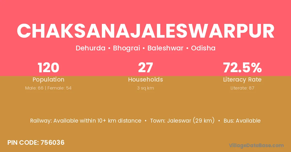 Chaksanajaleswarpur village has a total population of 120 people, of which 66 are males and 54 are females.