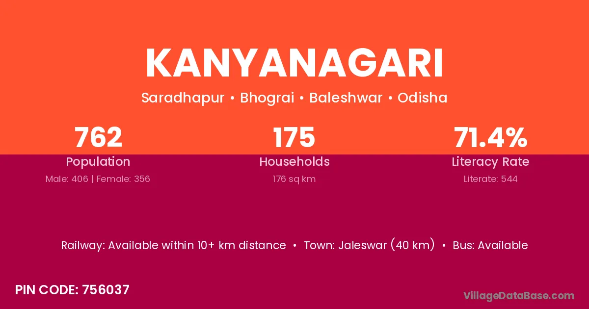 Jaleswar (40 km) is the nearest town to Kanyanagari village for major economic activities and is located approximately 40 km away.