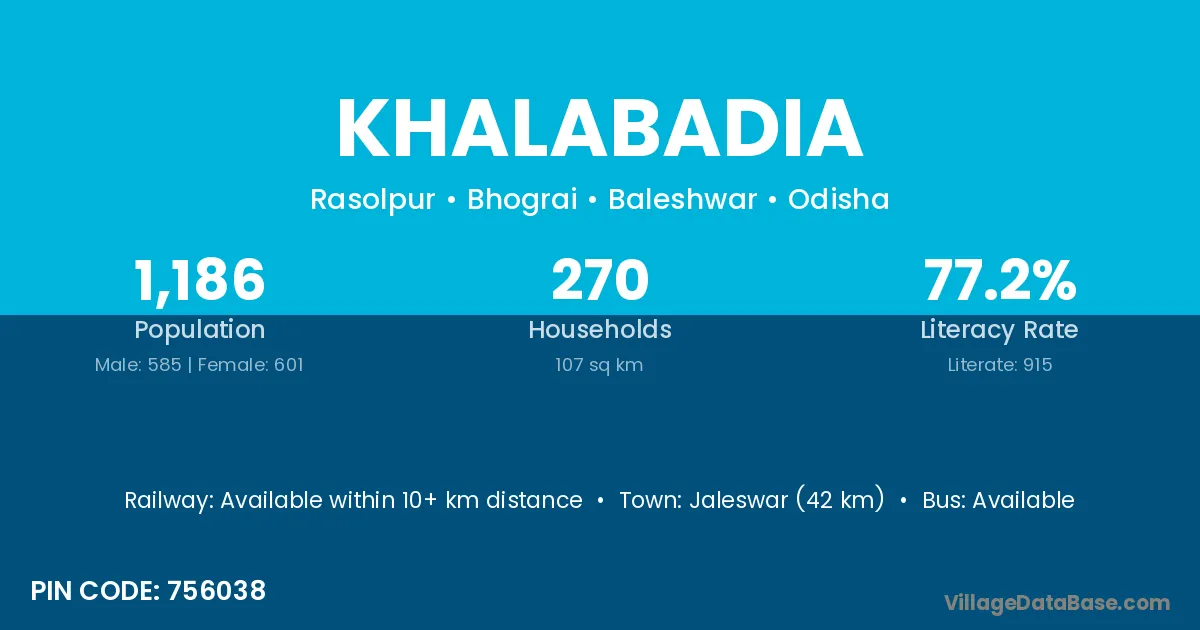 Jaleswar (42 km) is the nearest town to Khalabadia village for major economic activities and is located approximately 42 km away.