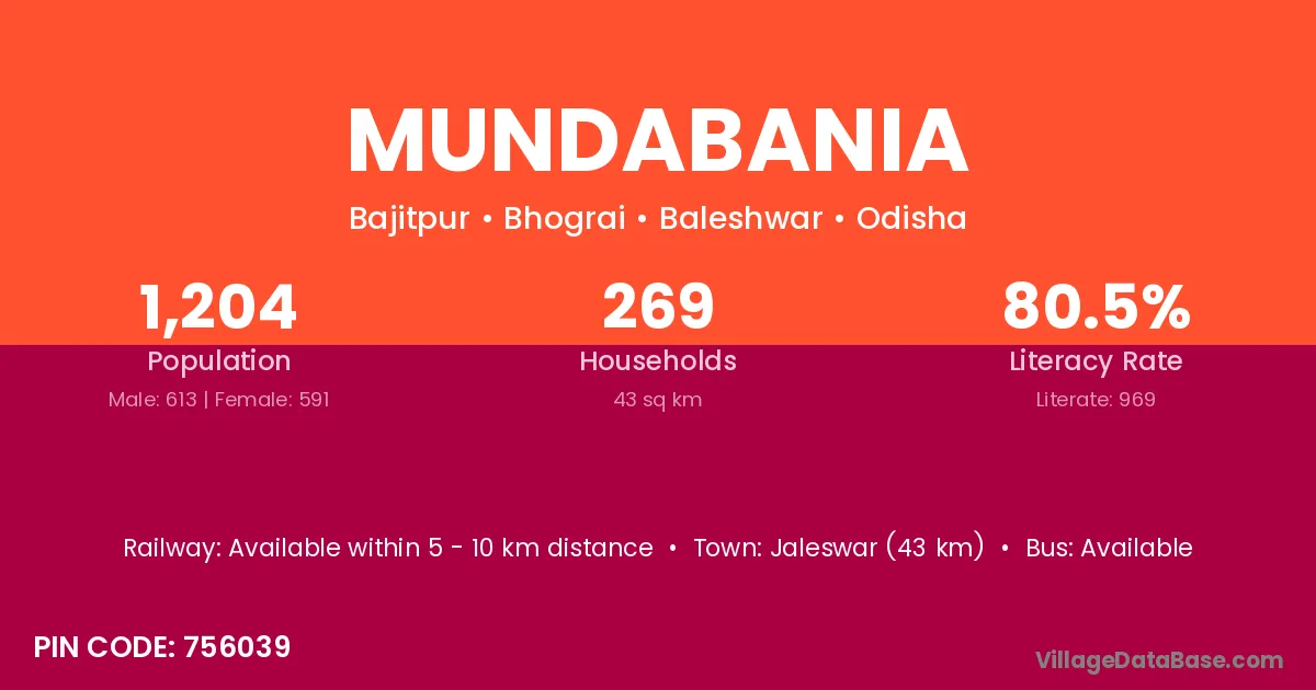 Jaleswar (43 km) is the nearest town to Mundabania village for major economic activities and is located approximately 43 km away.