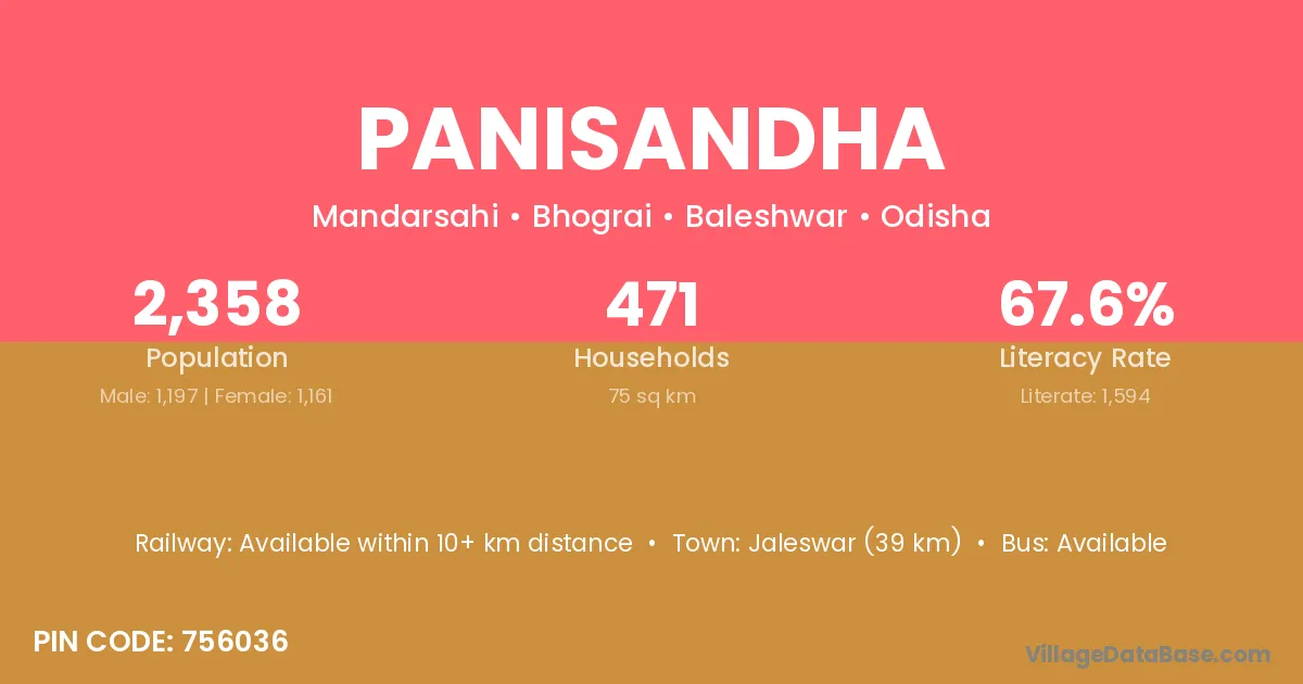 Jaleswar (39 km) is the nearest town to Panisandha village for major economic activities and is located approximately 39 km away.
